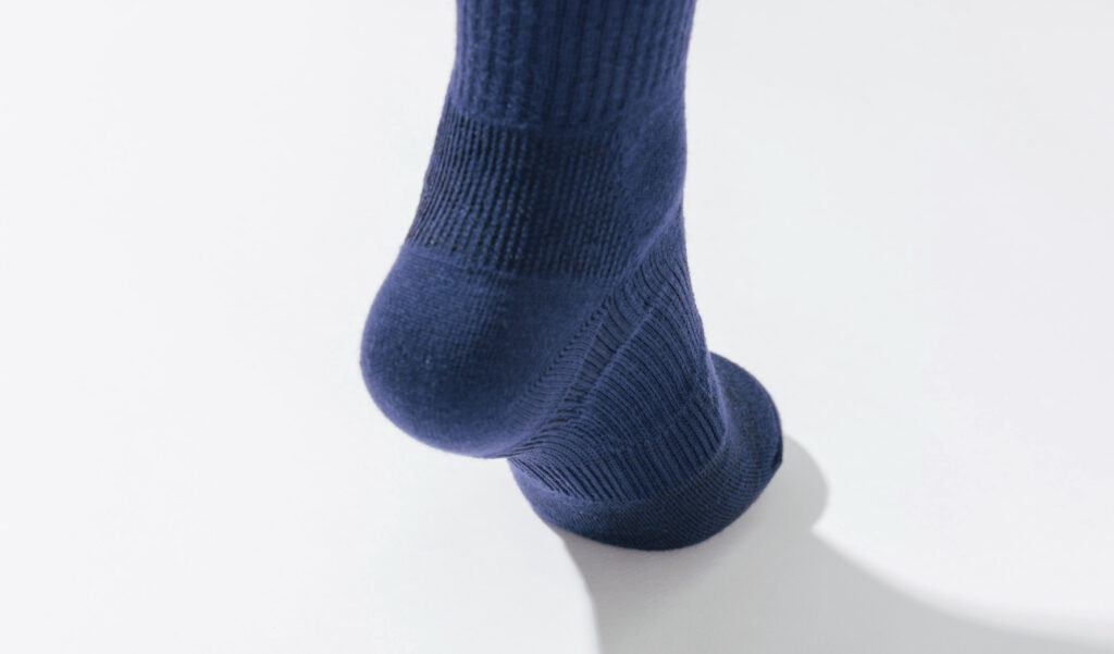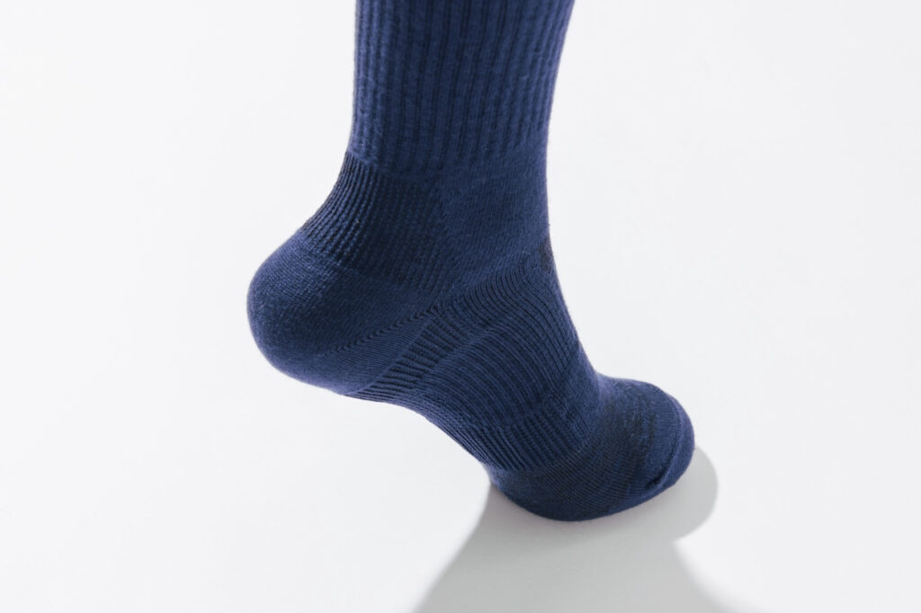 つま先とかかと部分を通常のナイロン糸よりも強靭な「コーデュラ®ナイロン」糸で補強。摩擦が多く傷みやすい部分をしっかりと保護し、「消耗品だから仕方ない…」とされていた靴下の穴あきトラブルを防ぎ、長持ちさせます。