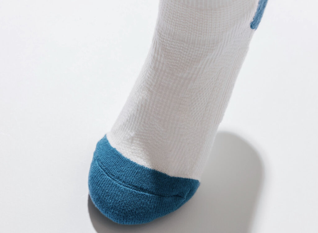 つま先とかかと部分はパイル編みでボリュームを持たせ、走行時に受ける衝撃をしっかり吸収します。