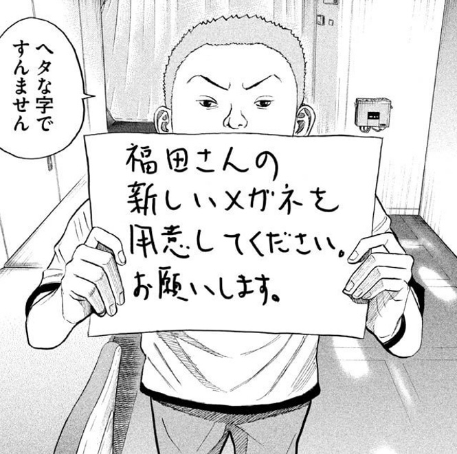 ほかにも、閉鎖環境試験で福田さんのメガネを踏んで割ってしまったやっさんが、新しいメガネをお願いするメモを書くシーン。その読みにくい手書きの文字は、初代担当編集・サディの直筆なのだとか。