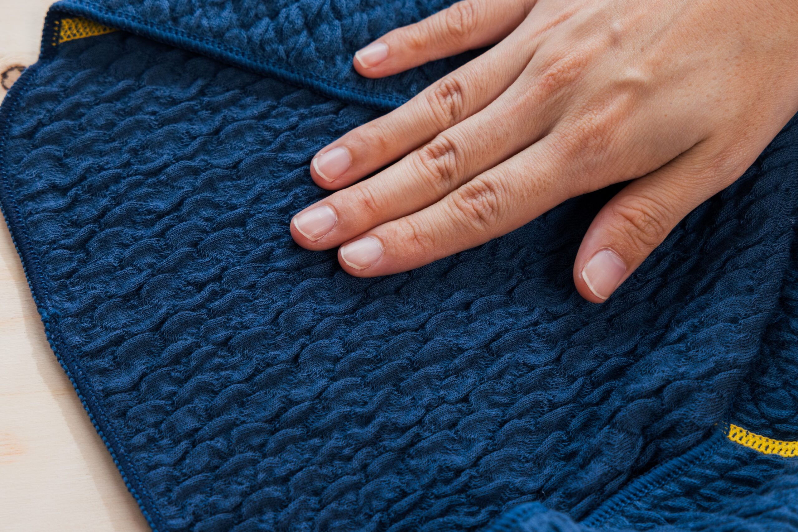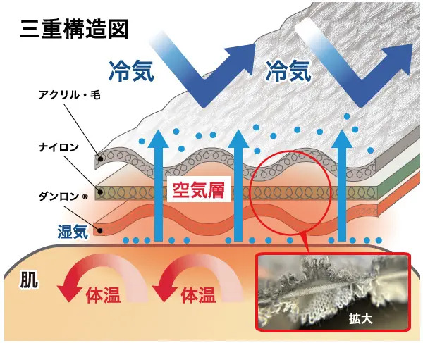 小林:肌側はダンロンというビニールで、これは世の中に2つしかない保水しない素材の1つなんです。そして外側は、乾きやすいニット素材。吸った汗がすぐに外にでていって蒸発するので、汗冷えしない、という仕組みになっています。